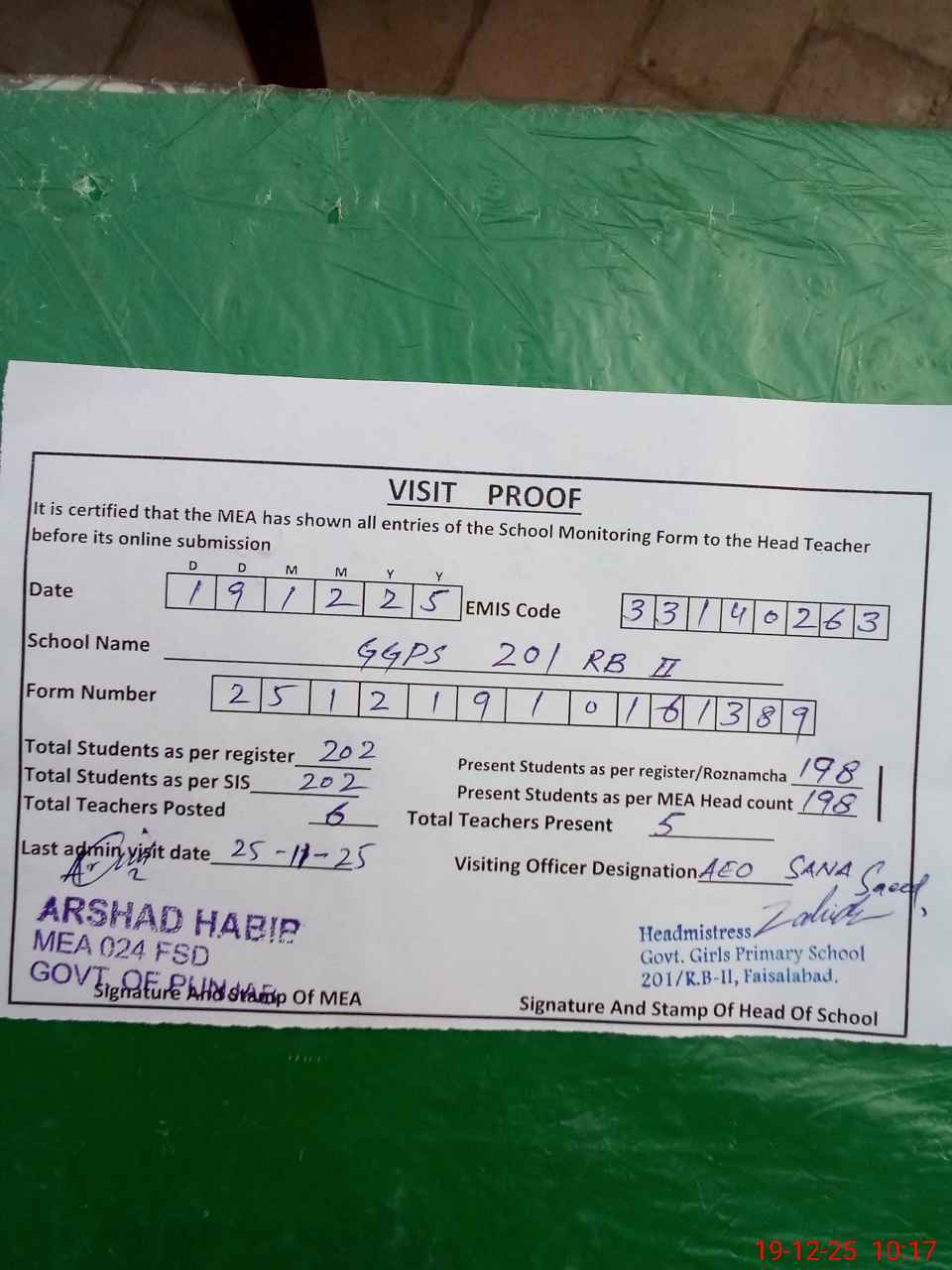 | Attendance Register | Head Teacher | MEA with School | Visit Proof |