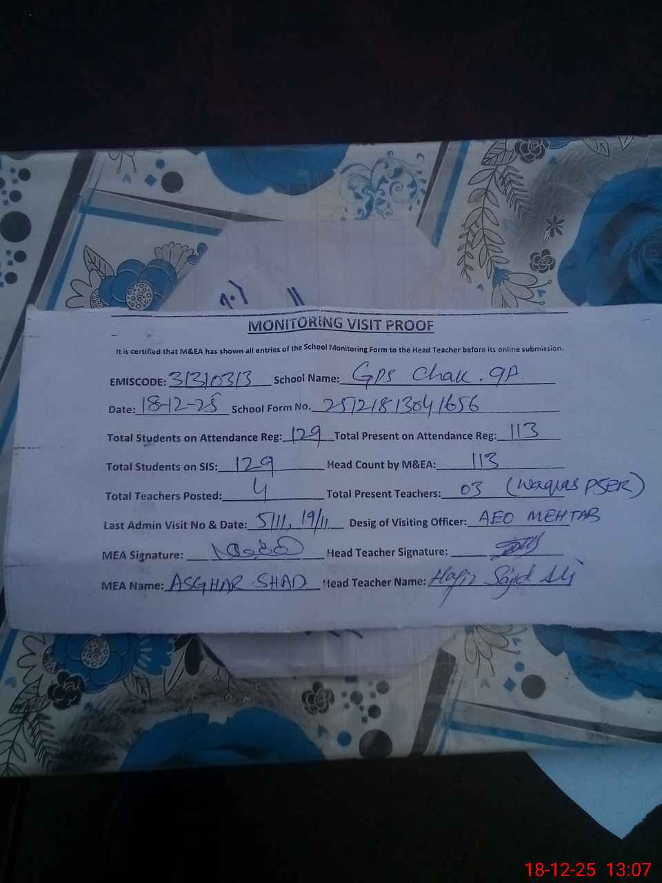 | EMIS Code: 31310313 | Name of School: GPS CHAK NO. 9/P | |||