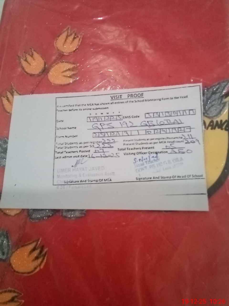 | Certified that this School was Inspected by the Undersigned MEA/DMO Today and the Information Stated Above is as Per Record. | |||||