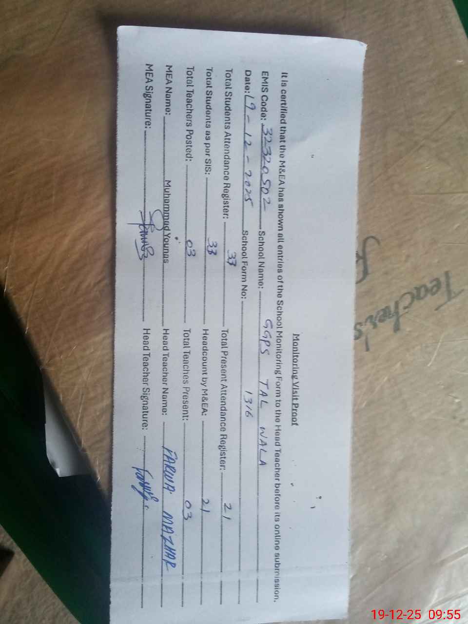 | Attendance Register | Head Teacher | MEA with School | Visit Proof |