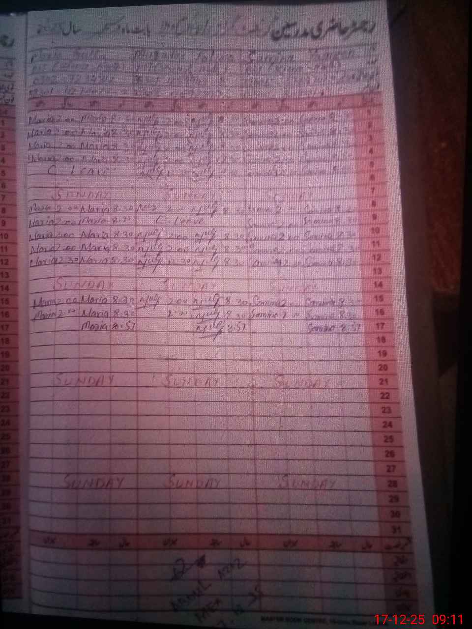 | CNIC | Full Name | Designation | R/C | Absence During Last Calender Month |