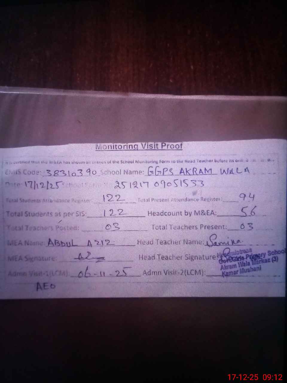 | Attendance Register | Head Teacher | MEA with School | Visit Proof |