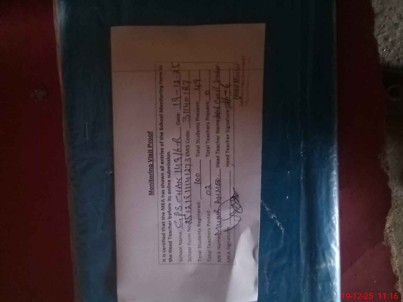 | Attendance Register | Head Teacher | MEA with School | Visit Proof |