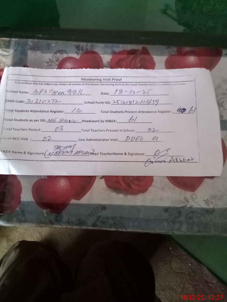 | Attendance Register | Head Teacher | MEA with School | Visit Proof |