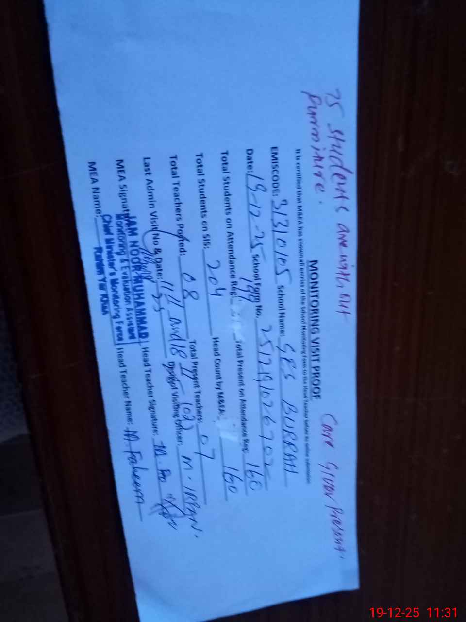 | Total no. of Classrooms: 8 No. of Classrooms Used for Teaching: 4 No. of Classrooms Storing Old Furniture, FTBs, etc: 0Comments if Any: Satisfactory 70 students are with out furniture Books record not available at school 02 toilet are repairable Boundary wall repairable |