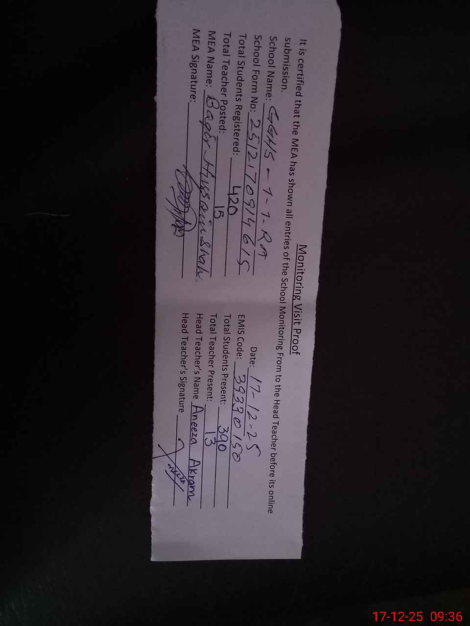 | Attendance Register | Head Teacher | MEA with School | Visit Proof |