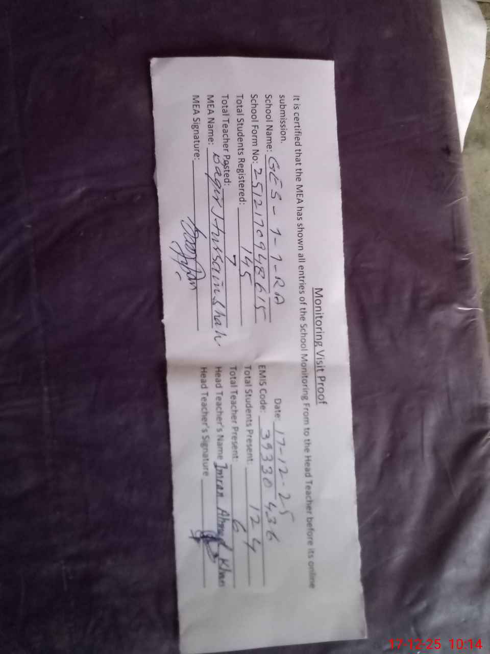 | Attendance Register | Head Teacher | MEA with School | Visit Proof |