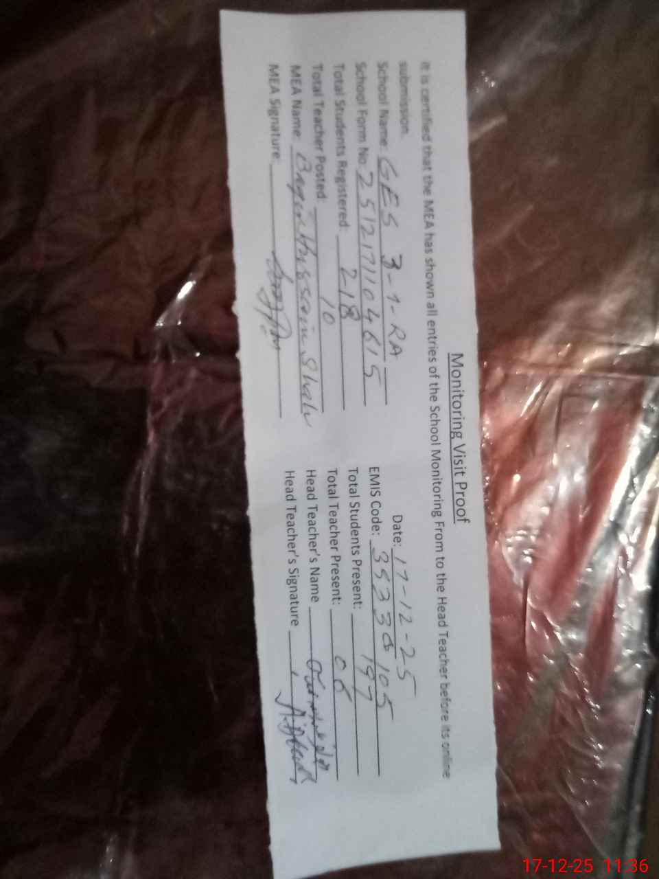 | Attendance Register | Head Teacher | MEA with School | Visit Proof |