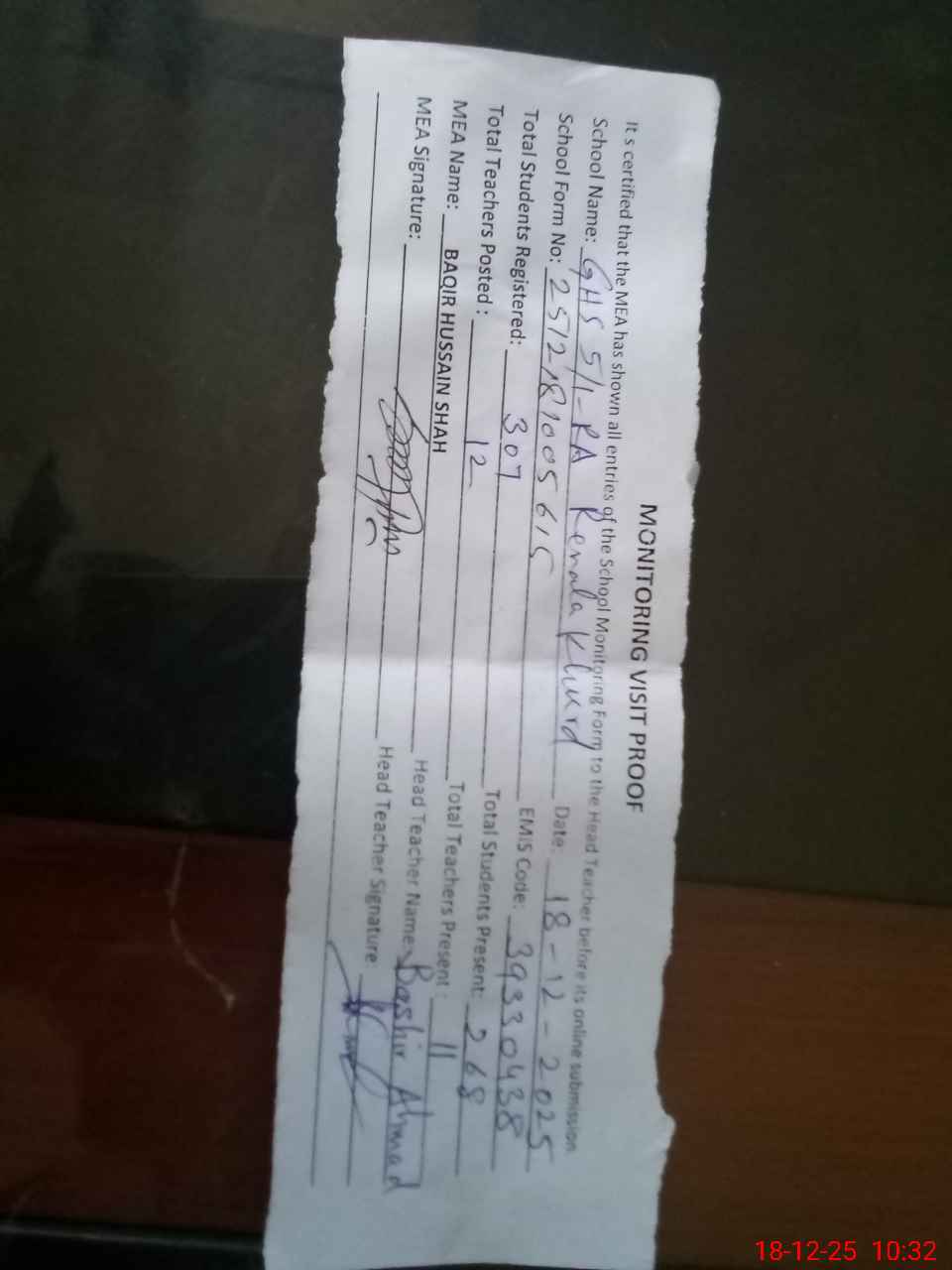 | Attendance Register | Head Teacher | MEA with School | Visit Proof |