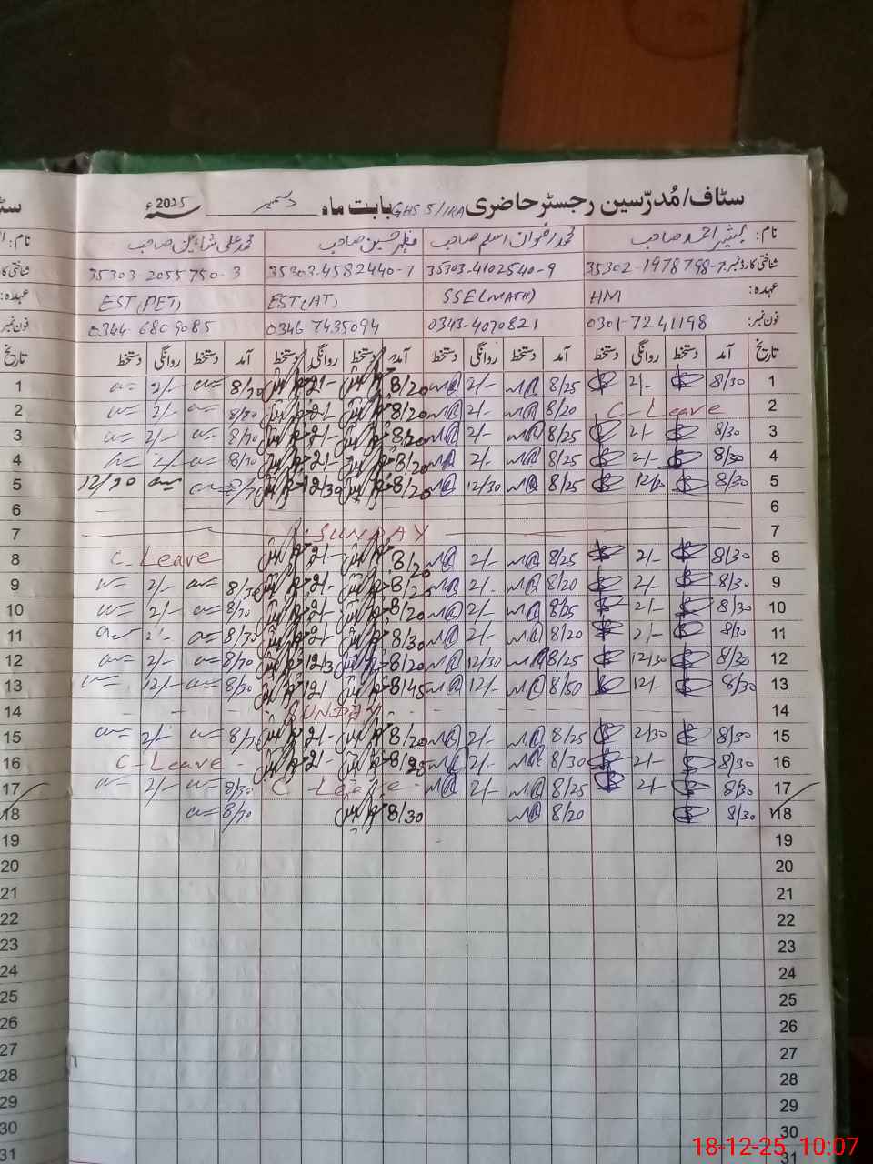 | CNIC | Full Name | Designation | R/C | Absence during last cal. month |