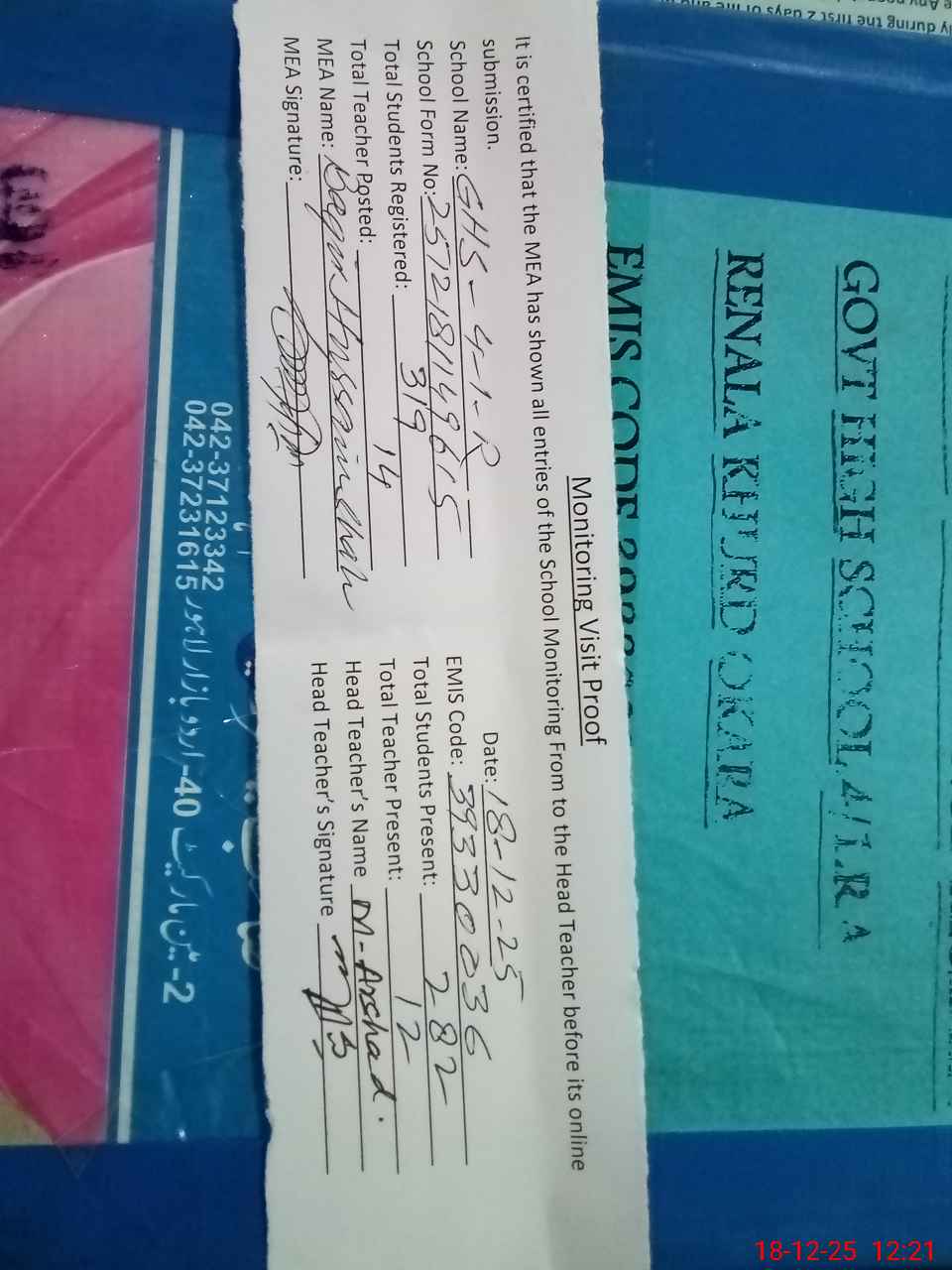 | EMIS Code: 39330036 | Name of School: GHS CHAK NO. 4/1-RA | |||