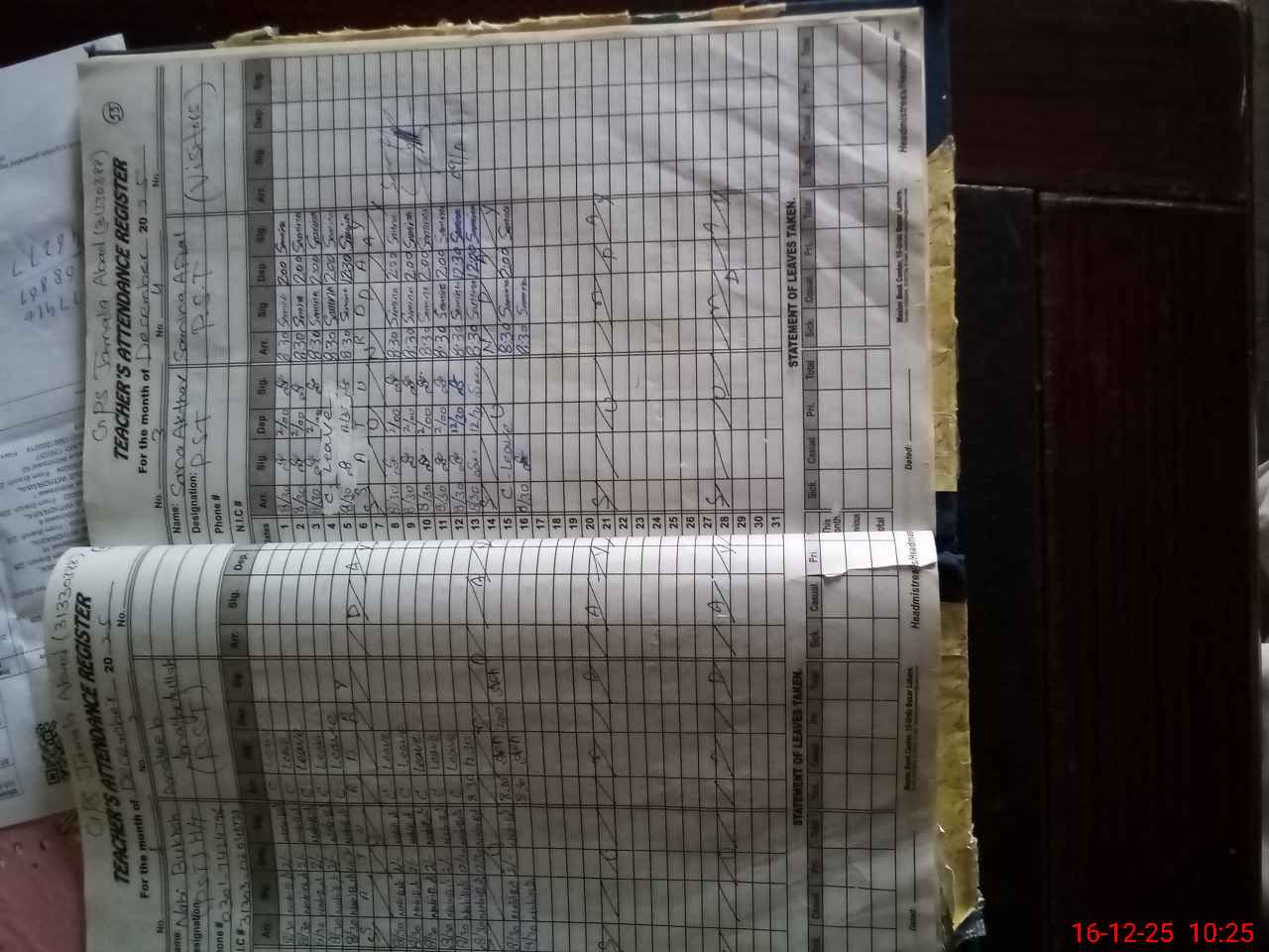 | CNIC | Full Name | Designation | R/C | Absence During Last Calender Month |
