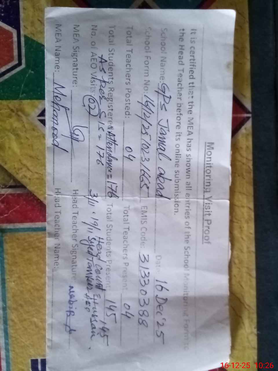| Attendance Register | Head Teacher | MEA with School | Visit Proof |