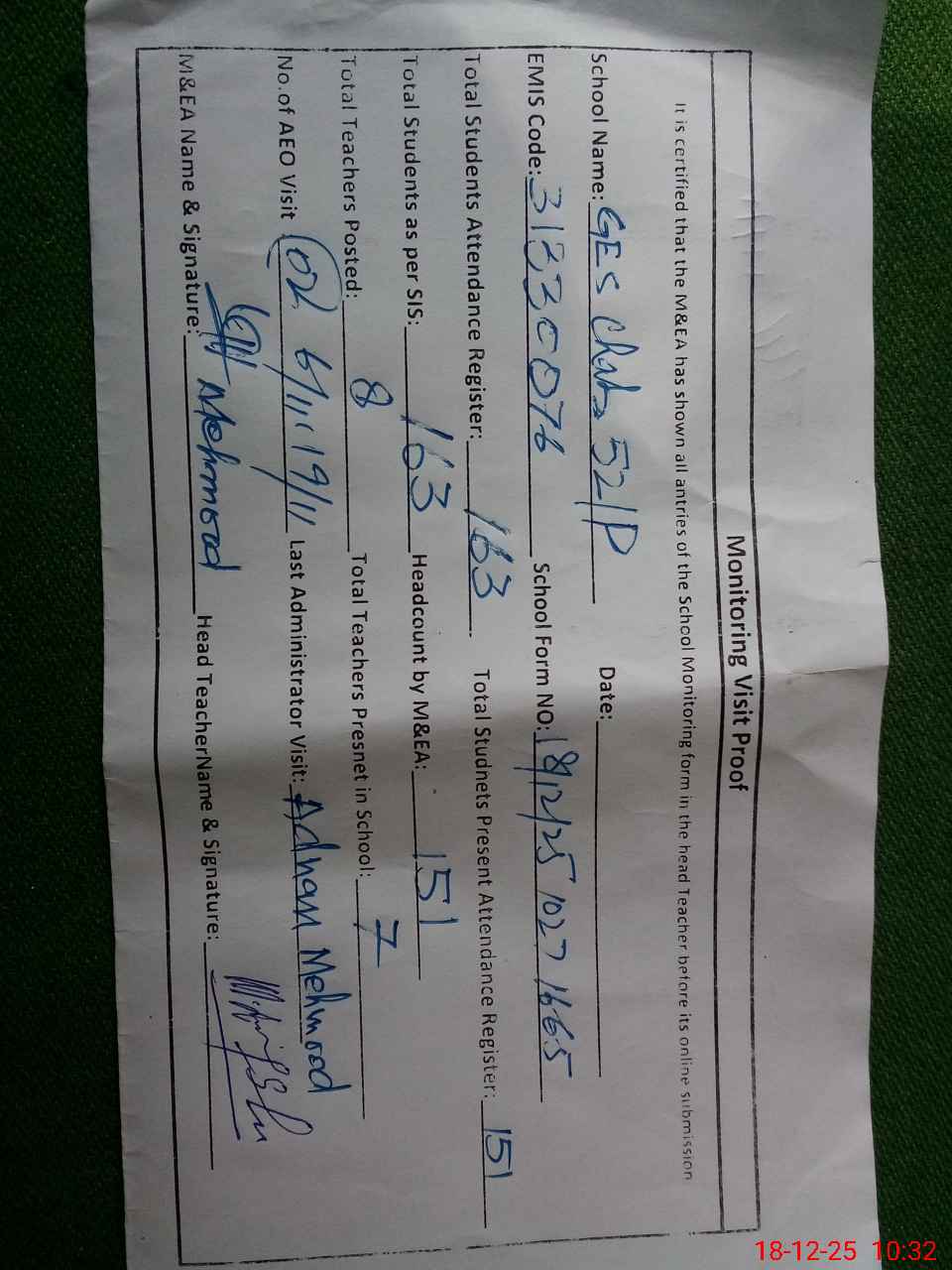| Attendance Register | Head Teacher | MEA with School | Visit Proof |