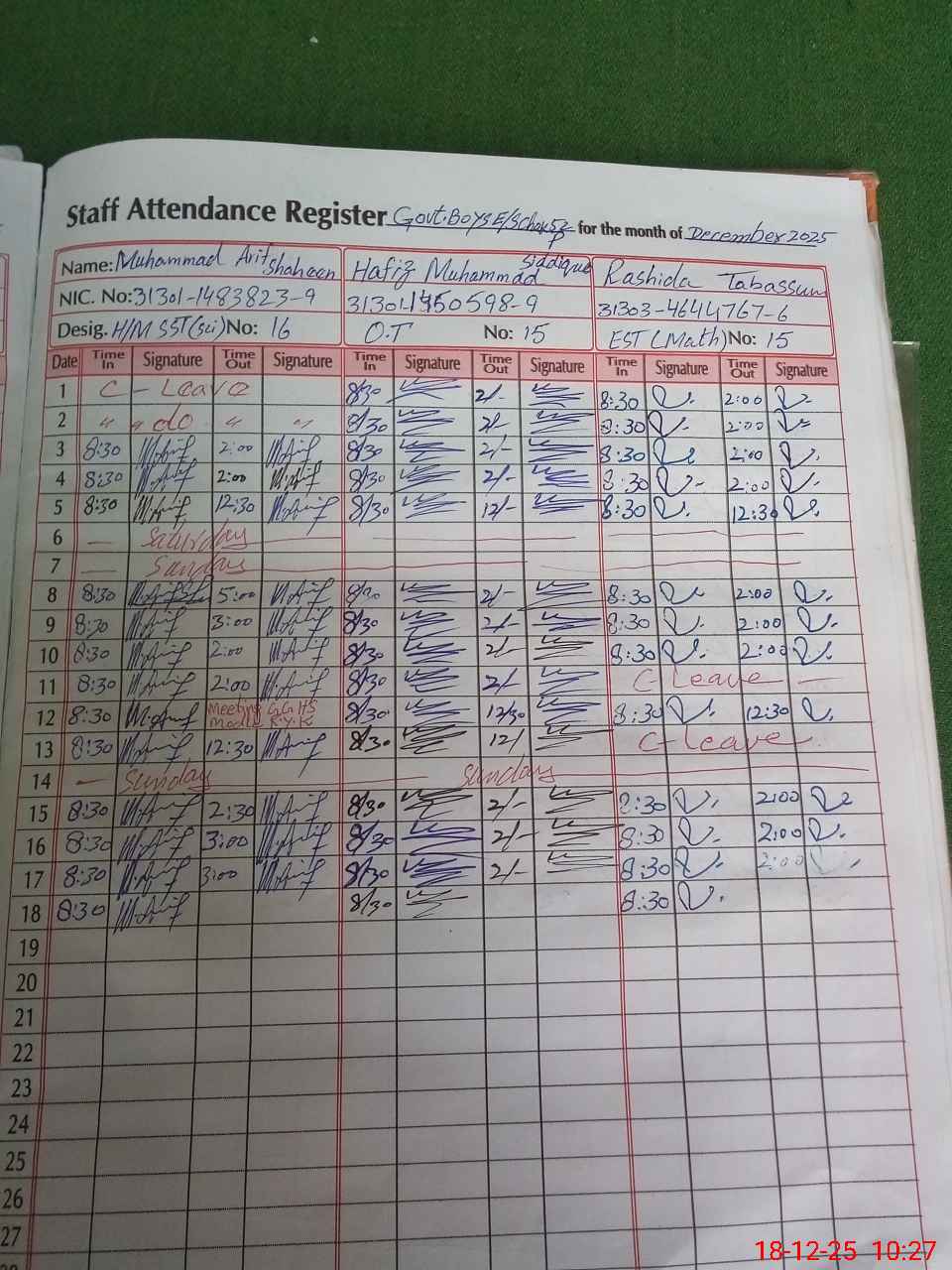| CNIC | Full Name | Designation | R/C | Absence during last cal. month |