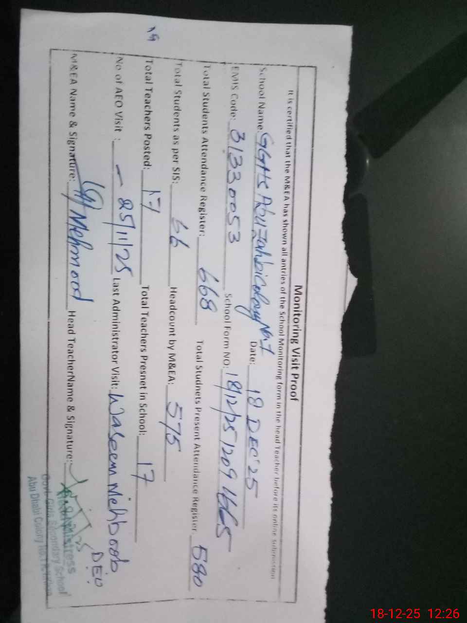 | Attendance Register | Head Teacher | MEA with School | Visit Proof |