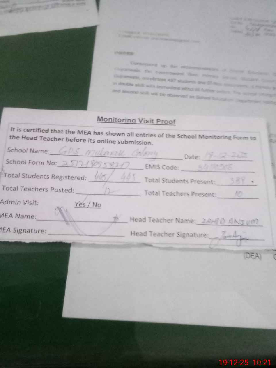 | Certified that this School was Inspected by the Undersigned MEA/DMO Today and the Information Stated Above is as Per Record. | |||||