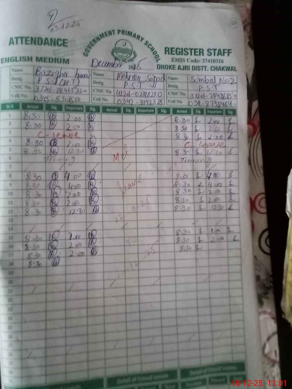 | CNIC | Full Name | Designation | R/C | Absence during last cal. month |