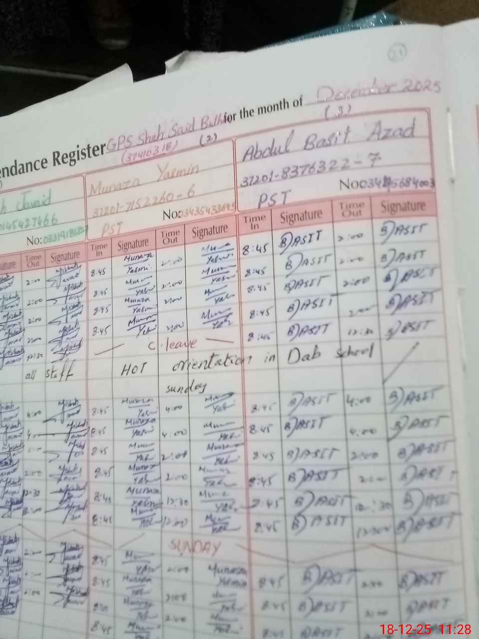 | CNIC | Full Name | Designation | R/C | Absence during last cal. month |