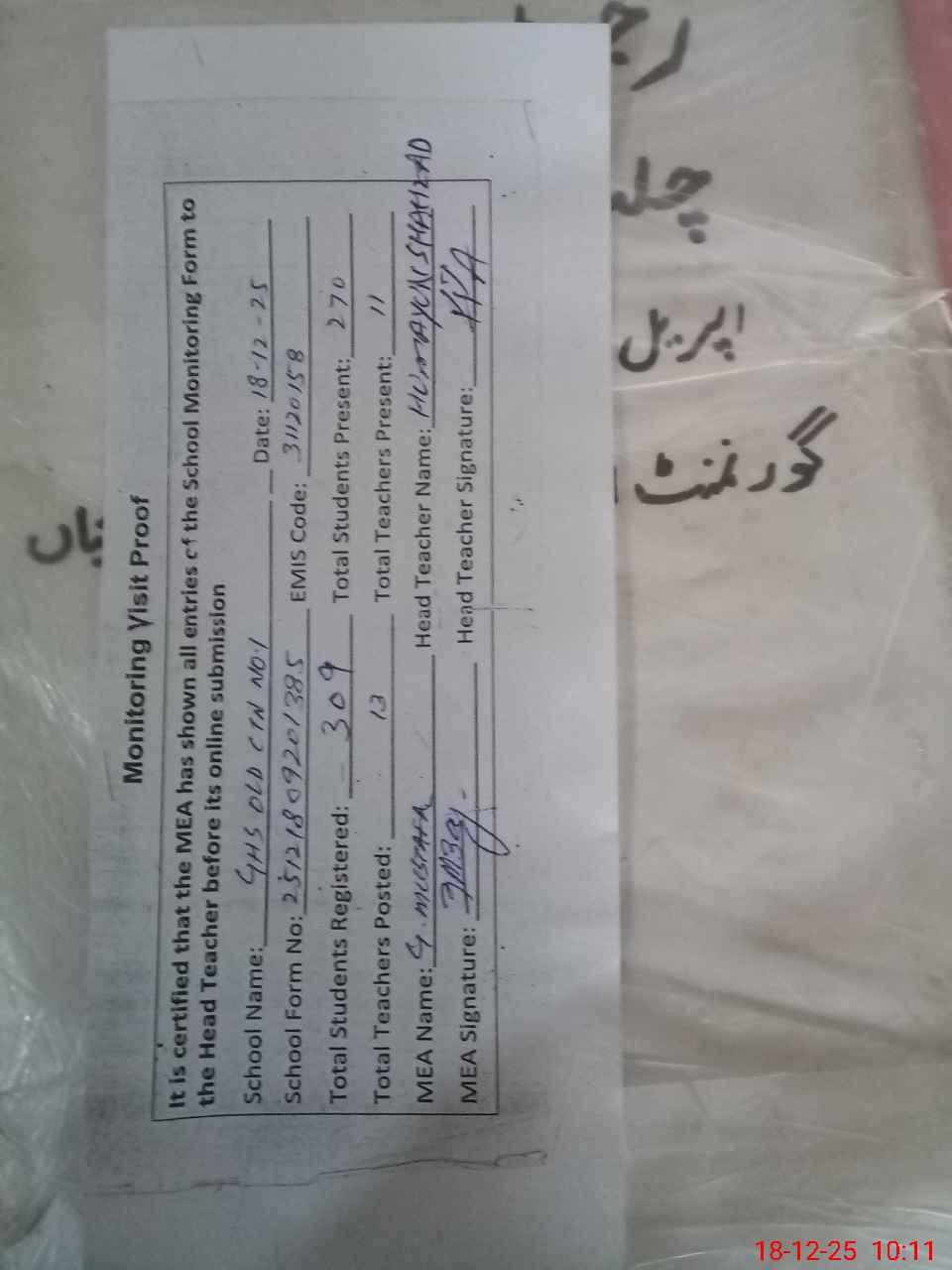 | Attendance Register | Head Teacher | MEA with School | Visit Proof |
