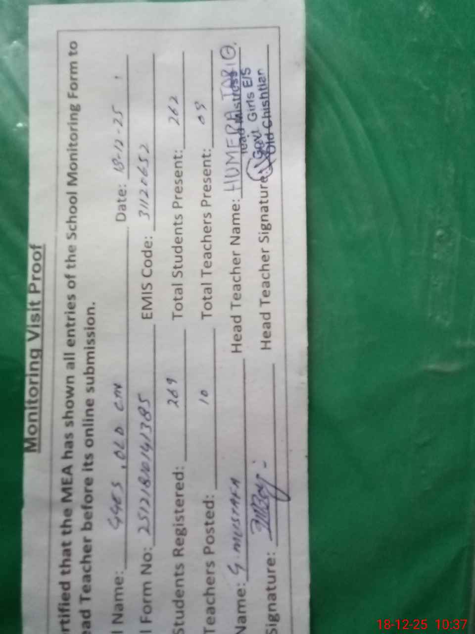 | Attendance Register | Head Teacher | MEA with School | Visit Proof |