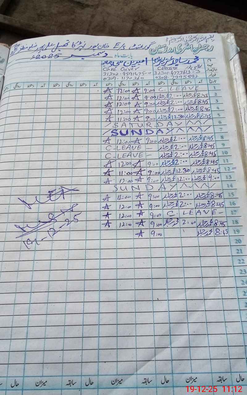 | CNIC | Full Name | Designation | R/C | Absence During Last Calender Month |