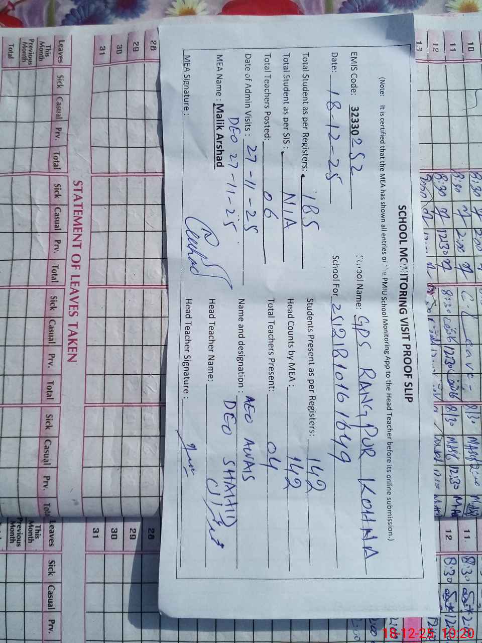 | EMIS Code: 32330252 | Name of School: GPS RANG PUR KOHNA | |||