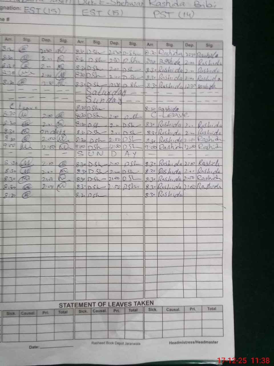 | CNIC | Full Name | Designation | R/C | Absence During Last Calender Month |