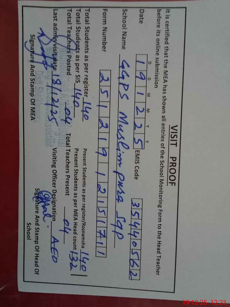 | Attendance Register | Head Teacher | MEA with School | Visit Proof |