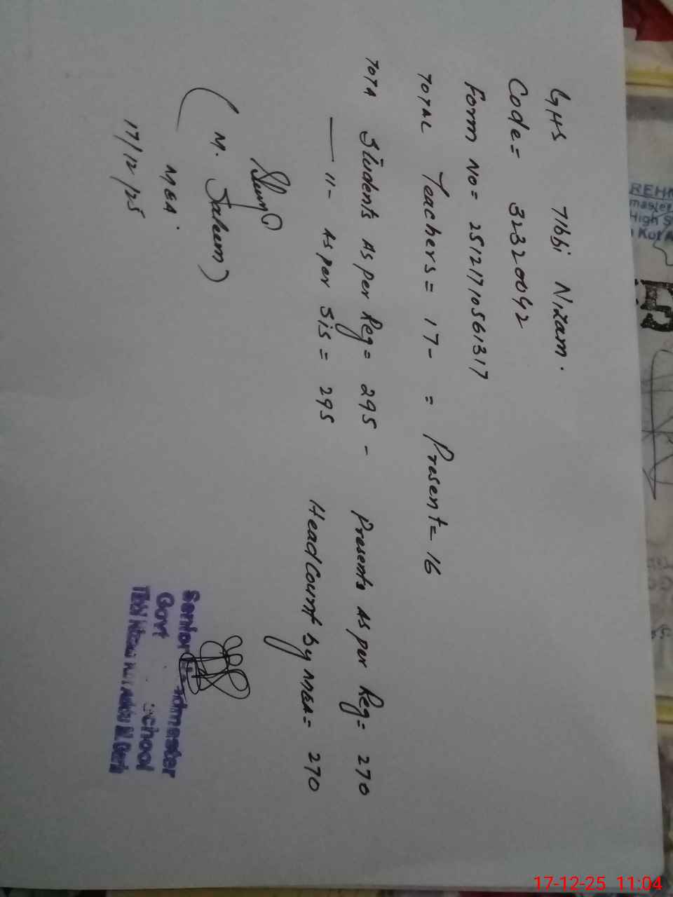 | Name: Mu**** Ra**** Designation: (School Headmaster's/Headmistress's) Incharge Headmaster Phone/Cell Number: 03**** |