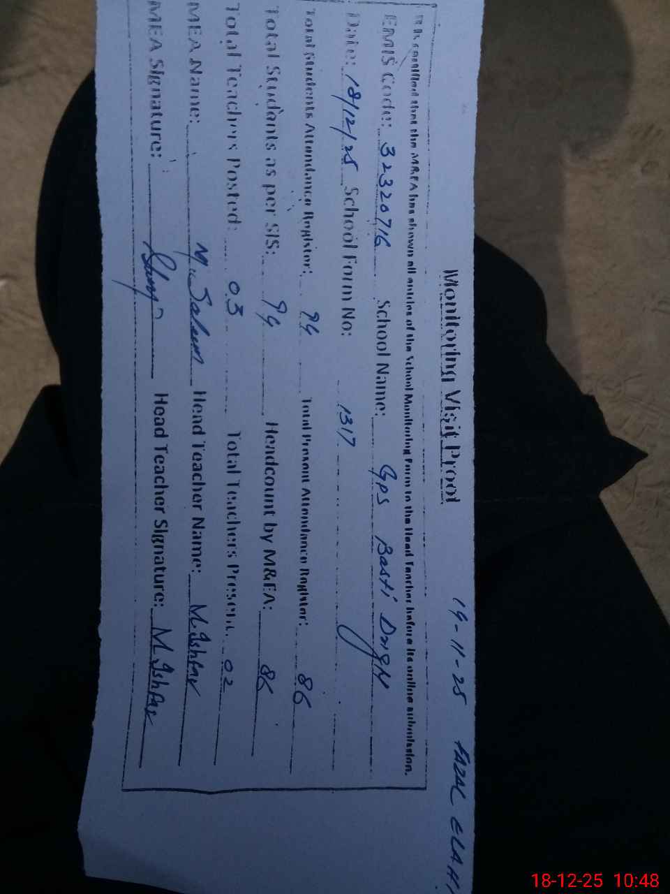 | Attendance Register | Head Teacher | MEA with School | Visit Proof |