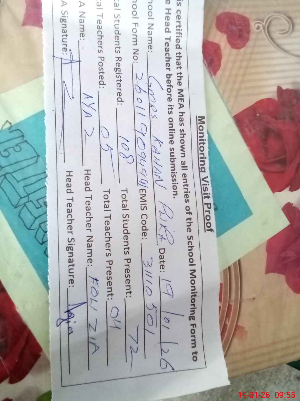 | Attendance Register | Head Teacher | MEA with School | Visit Proof |