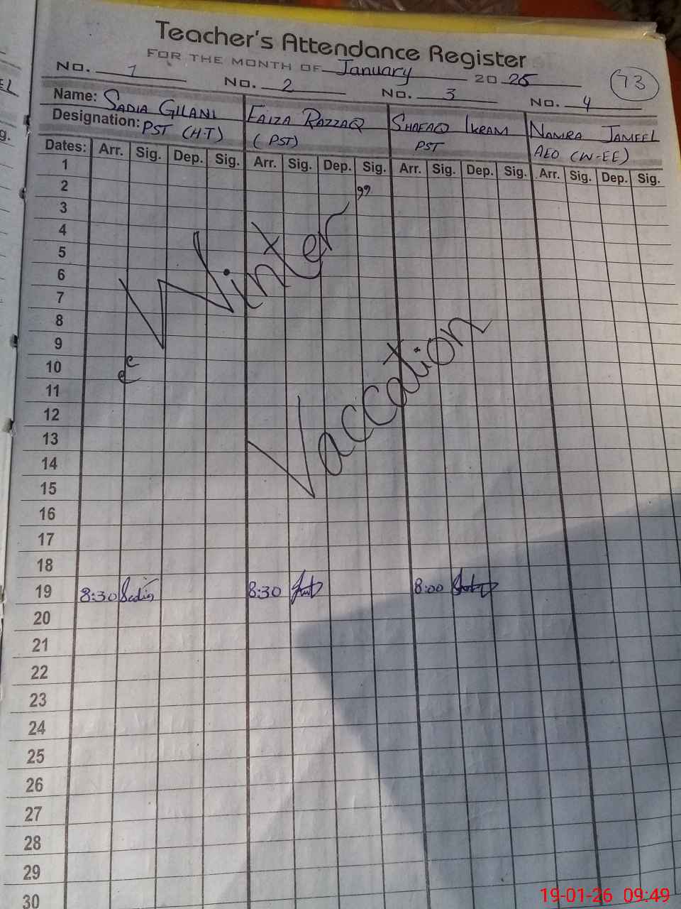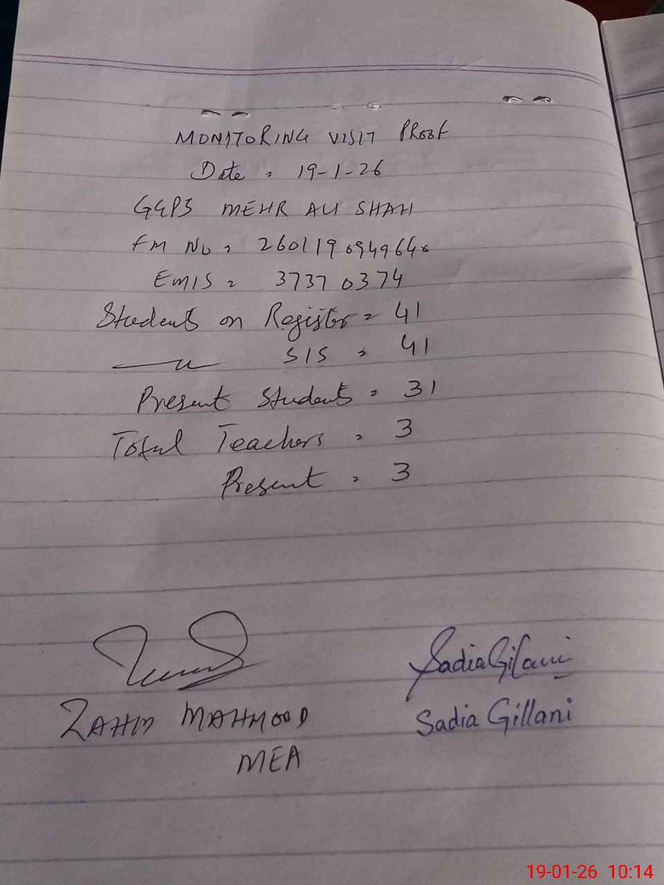 | Monitoring Date: 19-01-2026 | Start Time: 19-01-2026 09:45 AM | End Time: 19-01-2026 10:16 AM | Name of MEA: Za**** Me**** | |