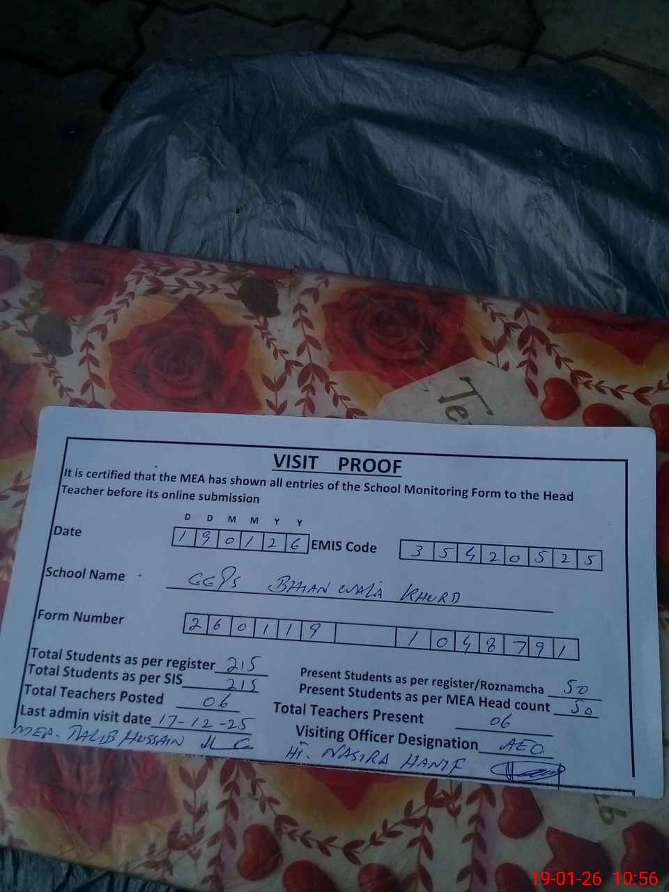 | Certified that this School was Inspected by the Undersigned MEA/DMO Today and the Information Stated Above is as Per Record. | |||||