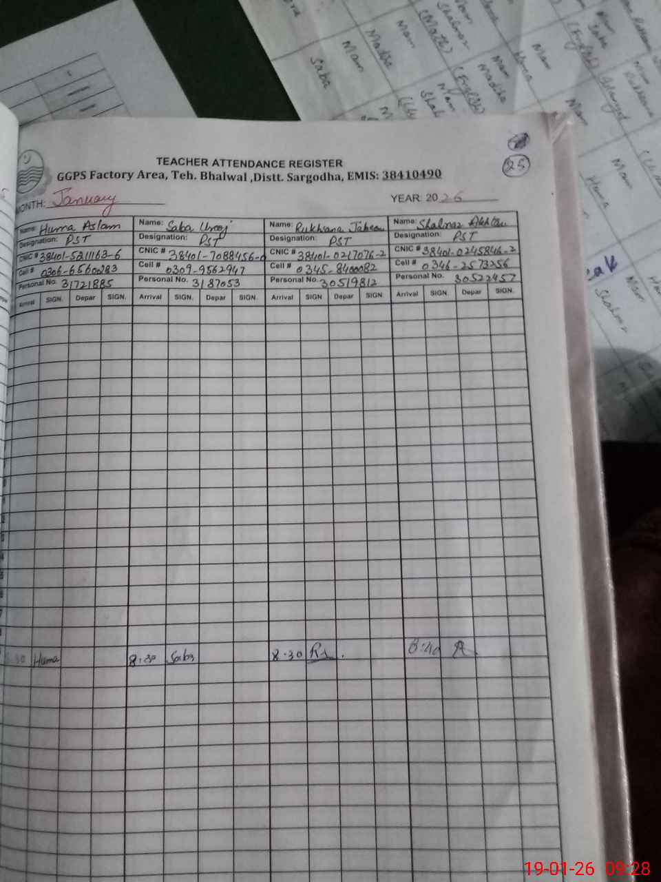 | CNIC | Full Name | Designation | R/C | Absence during last cal. month |