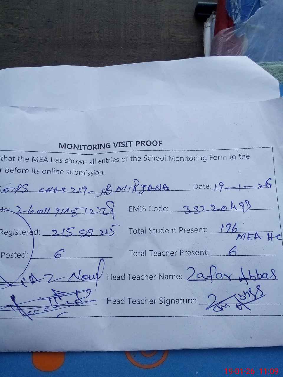 | Attendance Register | Head Teacher | MEA with School | Visit Proof |
