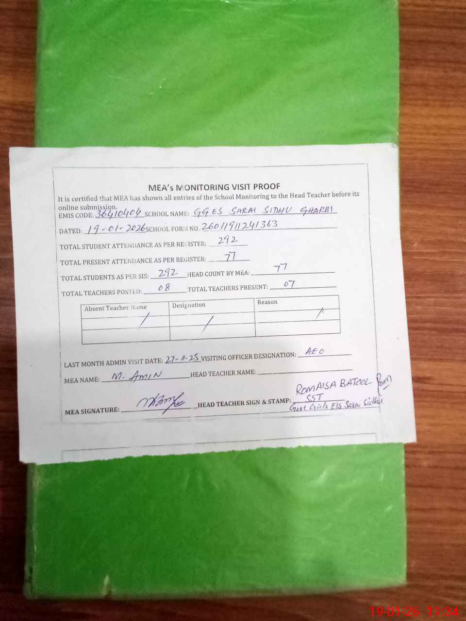 | Attendance Register | Head Teacher | MEA with School | Visit Proof |