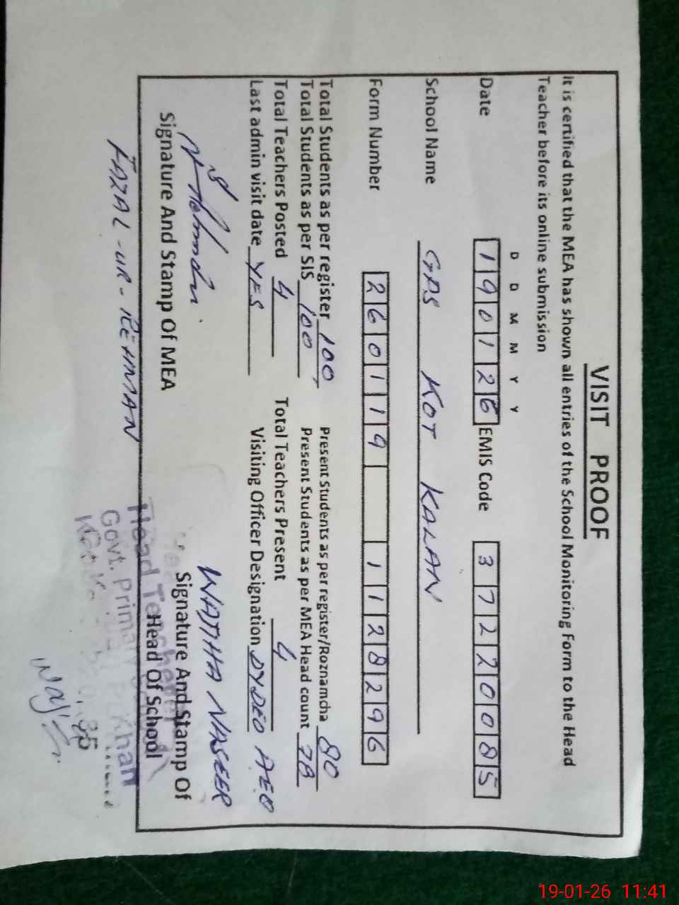 | Attendance Register | Head Teacher | MEA with School | Visit Proof |