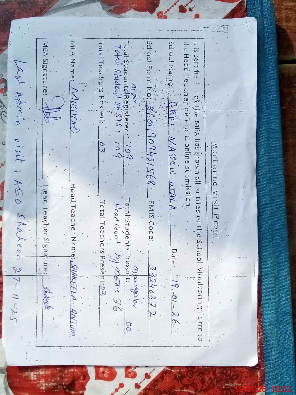 | Attendance Register | Head Teacher | MEA with School | Visit Proof |
