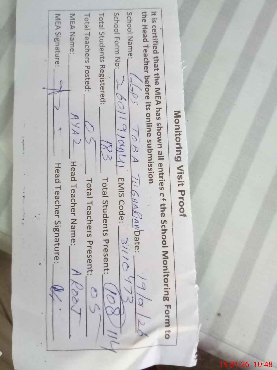 | Attendance Register | Head Teacher | MEA with School | Visit Proof |