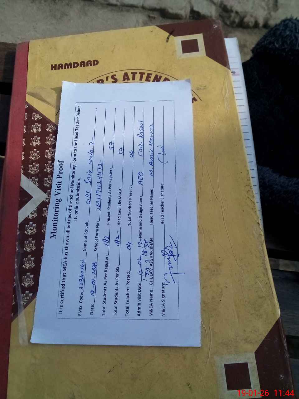 | Attendance Register | Head Teacher | MEA with School | Visit Proof |