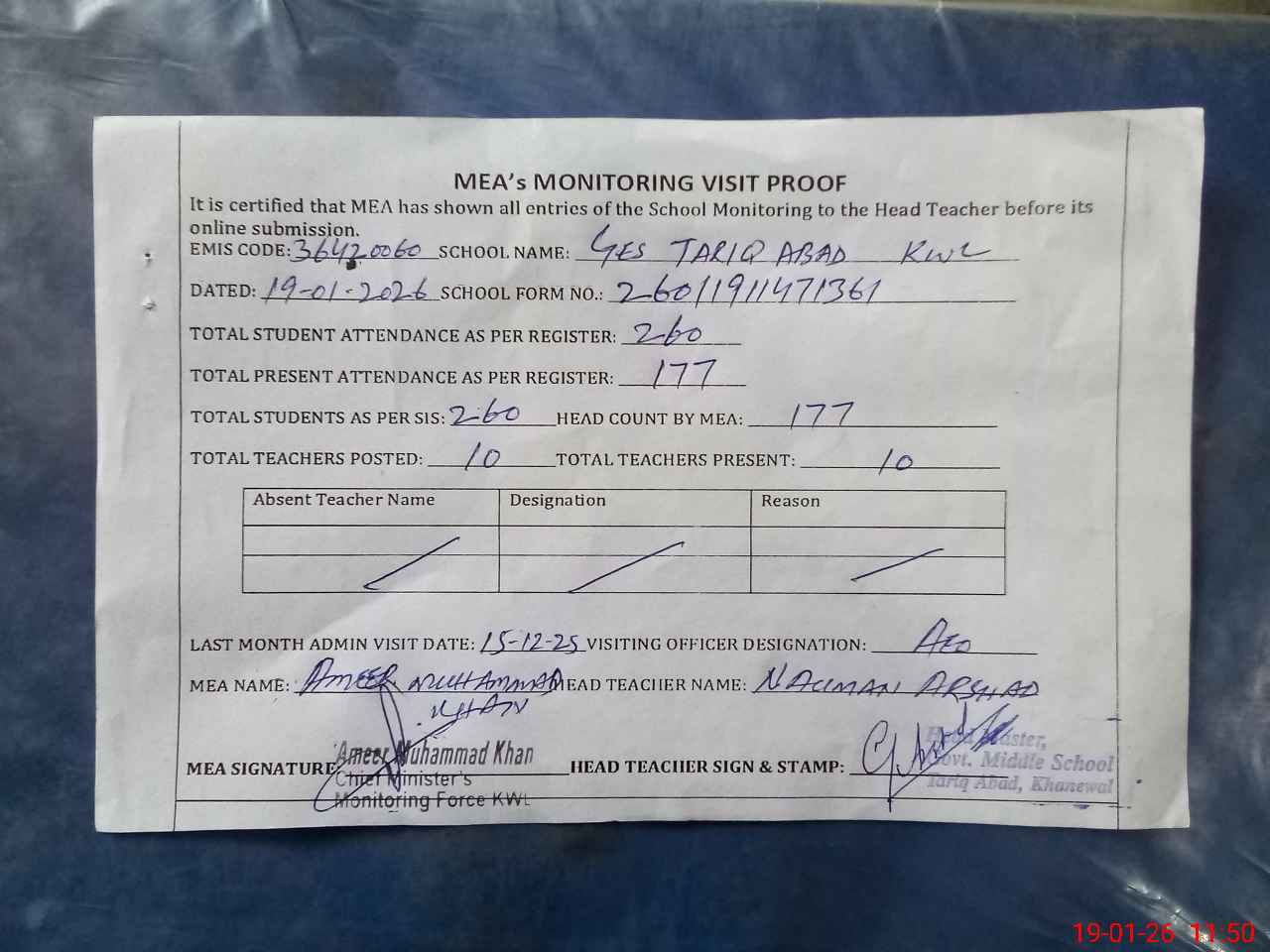 | Attendance Register | Head Teacher | MEA with School | Visit Proof |