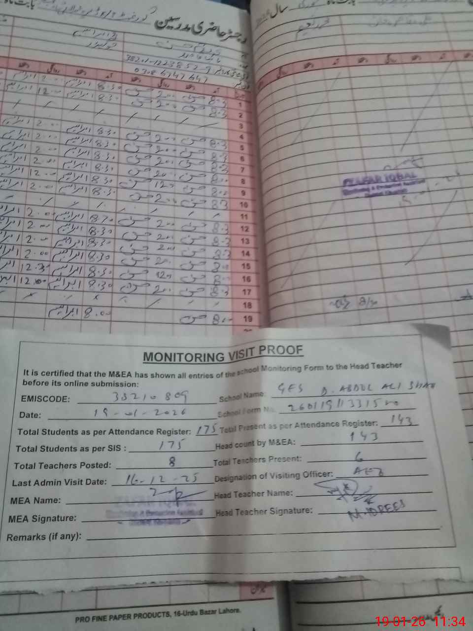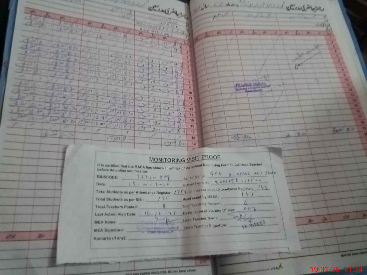 | Attendance Register | Head Teacher | MEA with School | Visit Proof |