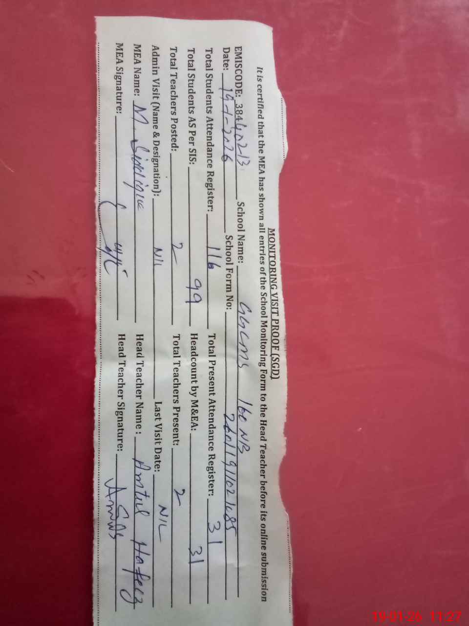 | Attendance Register | Head Teacher | MEA with School | Visit Proof |