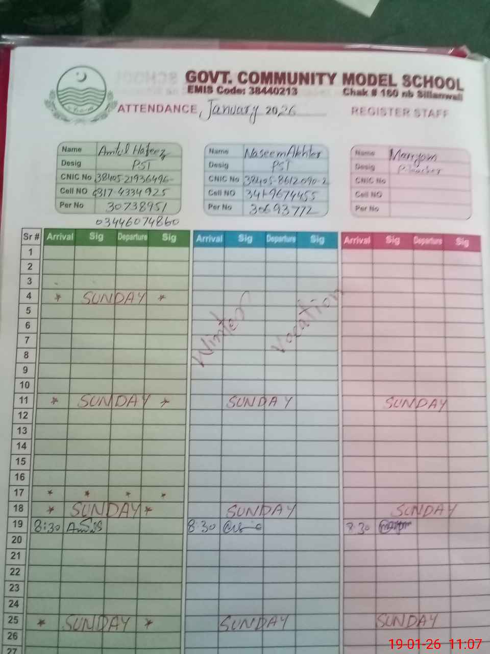 | CNIC | Full Name | Designation | R/C | Absence During Last Calender Month |