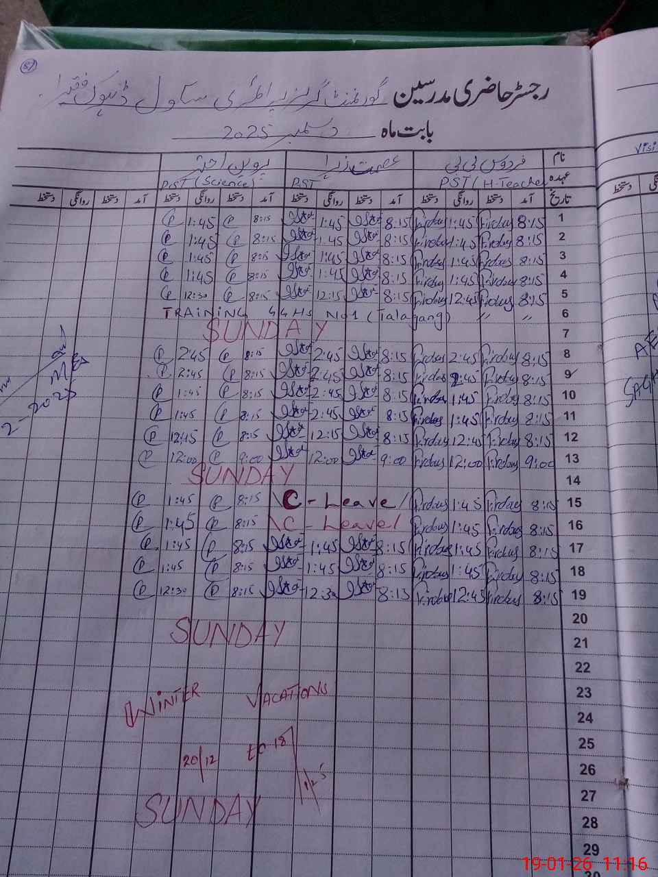 | CNIC | Full Name | Designation | R/C | Absence During Last Calender Month |