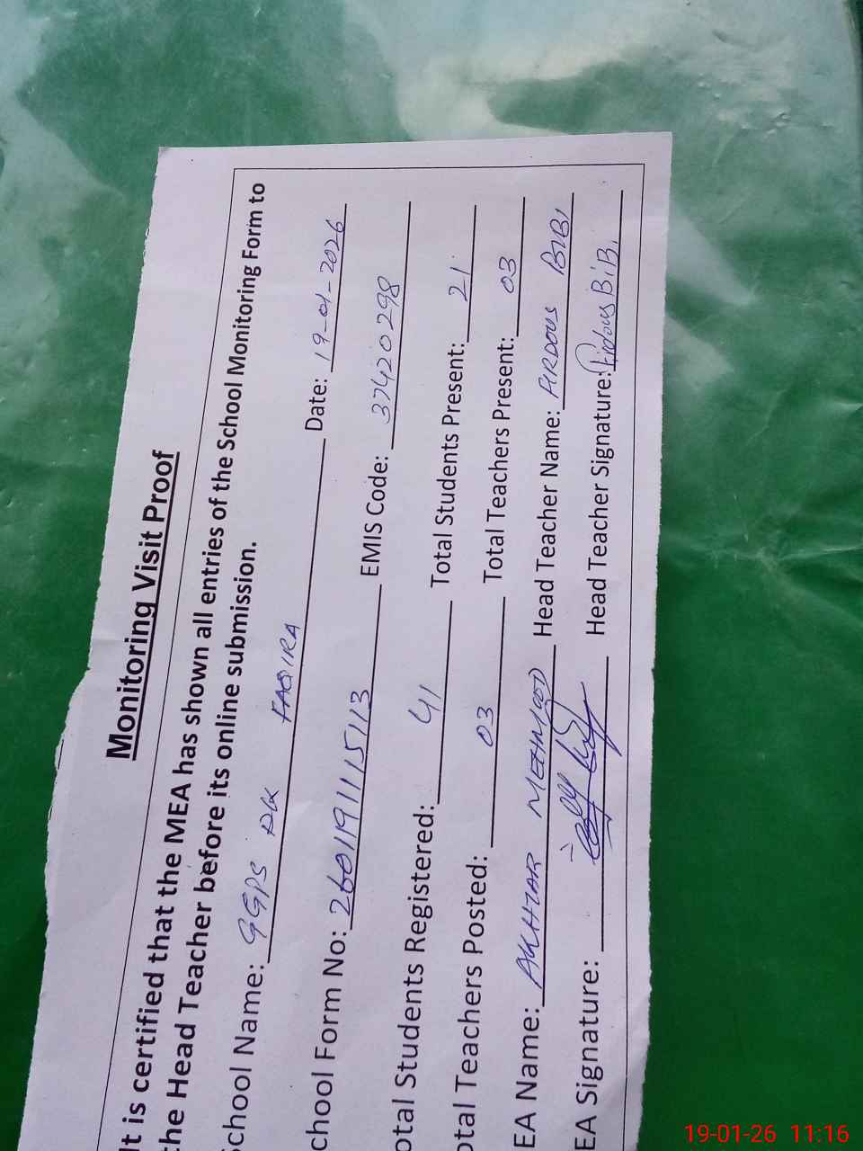 | Attendance Register | Head Teacher | MEA with School | Visit Proof |
