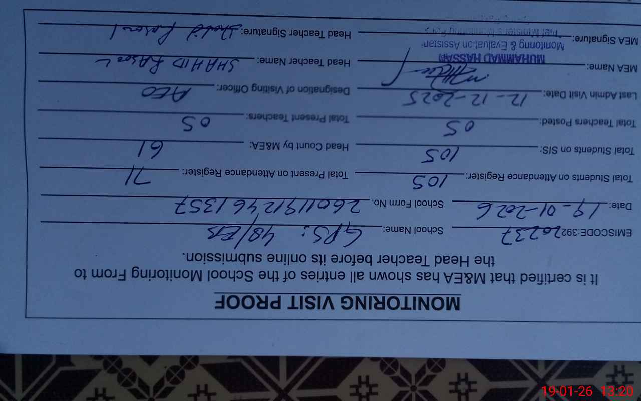 | Certified that this School was Inspected by the Undersigned MEA/DMO Today and the Information Stated Above is as Per Record. | |||||