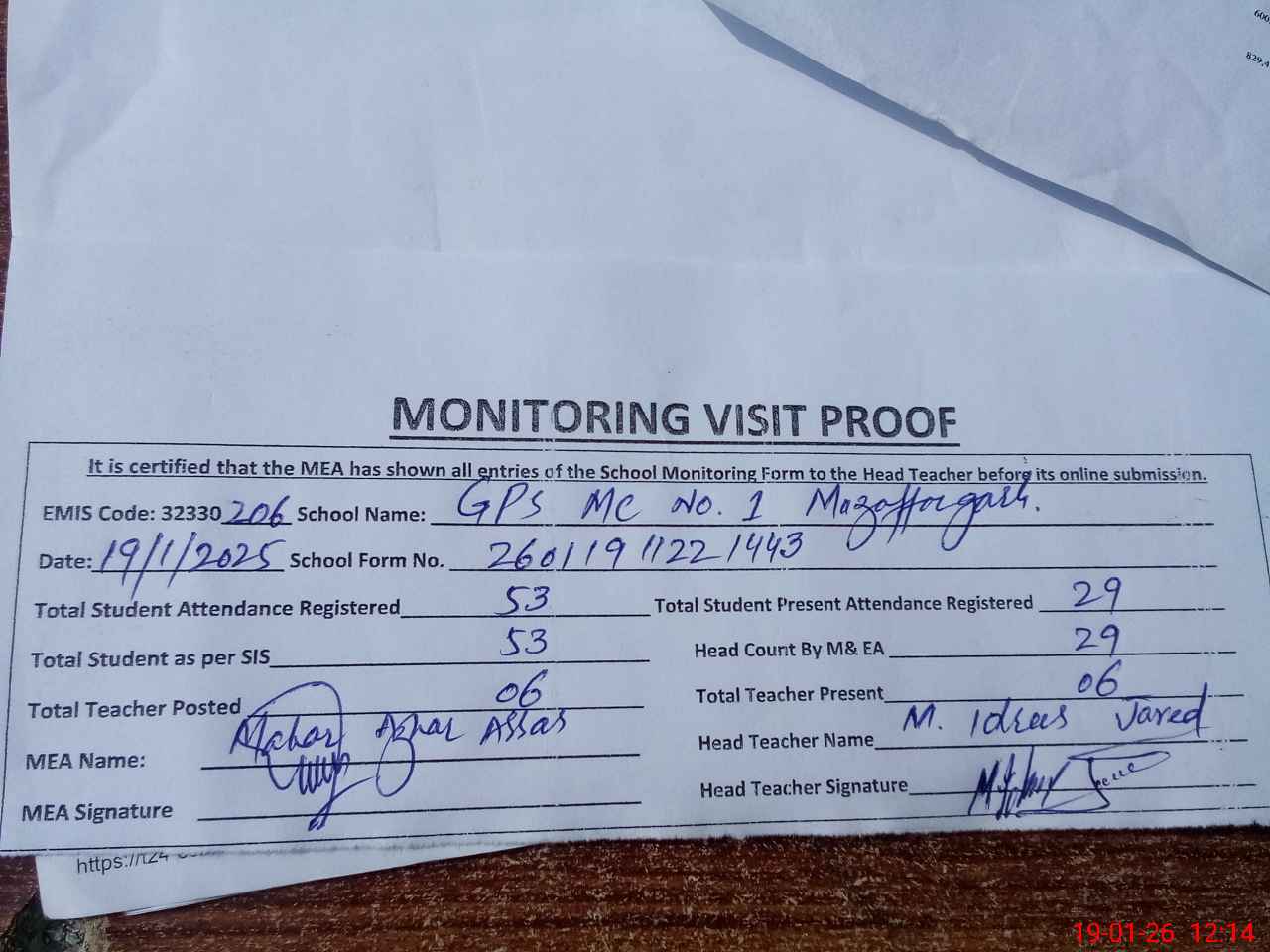 | EMIS Code: 32330206 | Name of School: GPS MC NO. 1 MUZAFFARGARH | |||