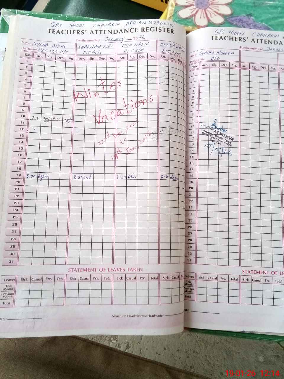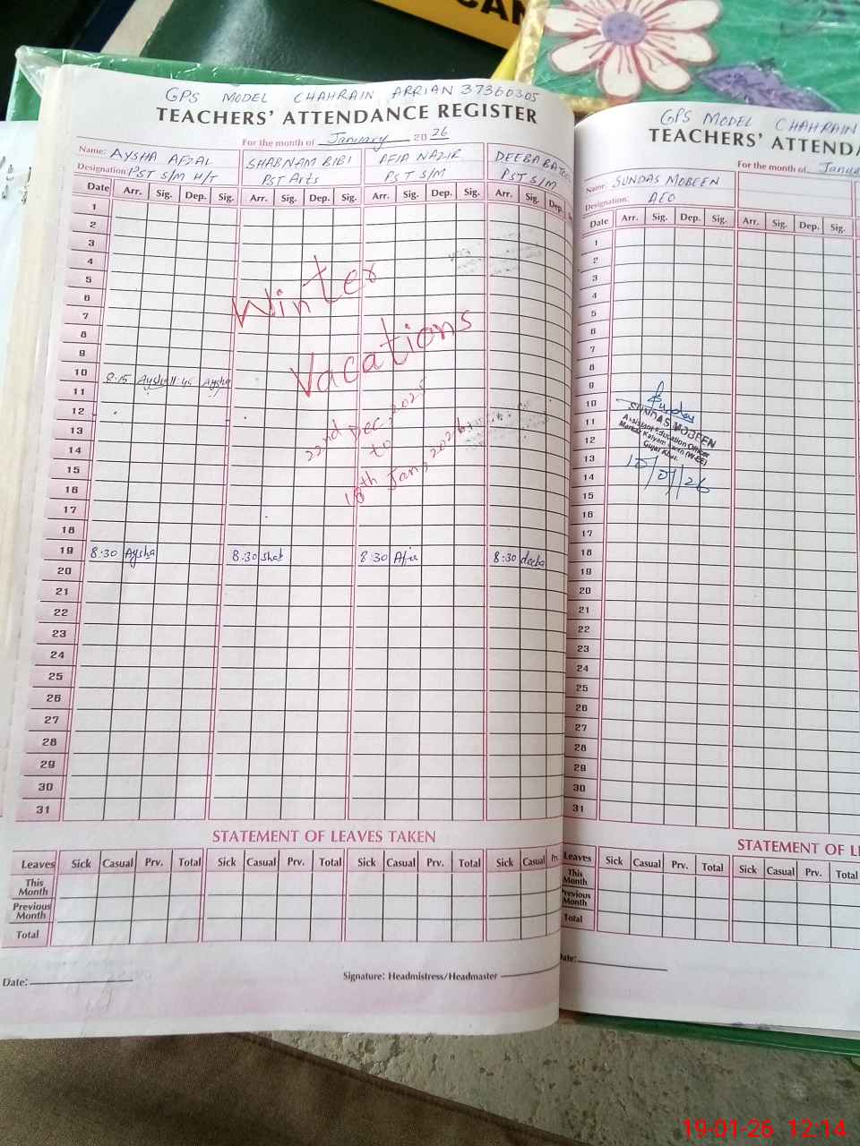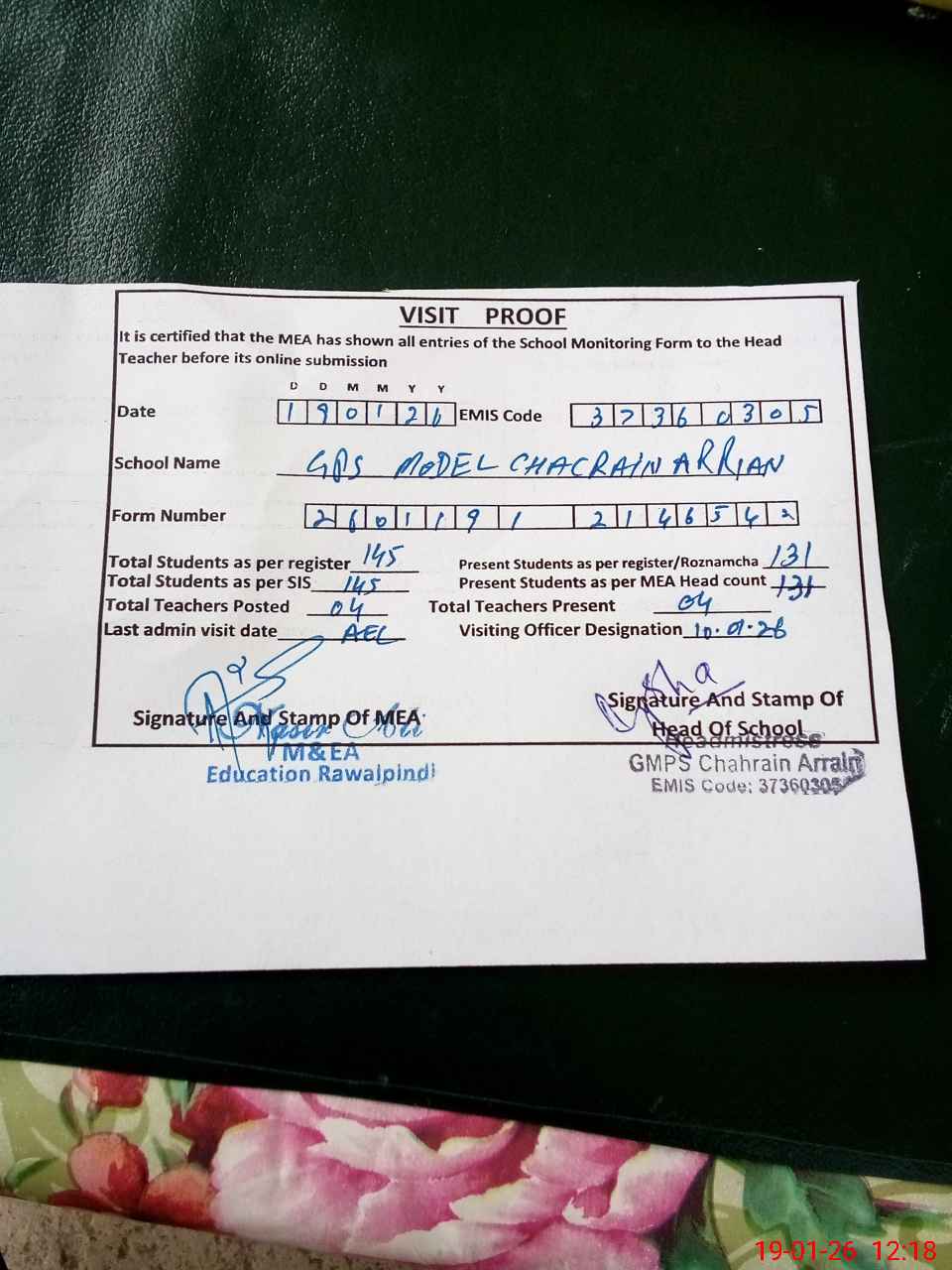 | Attendance Register | Head Teacher | MEA with School | Visit Proof |